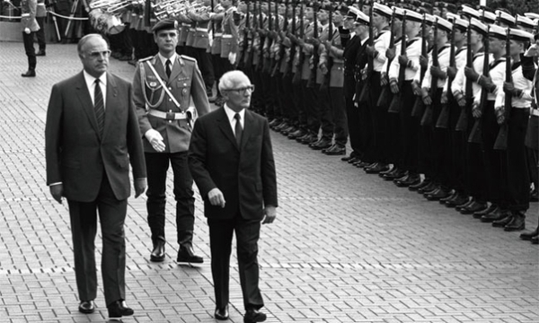 (1987년 콜과 호네커. "역사 속을 거니는 신의 옷자락을 잡아채는 것이 정치가의 책무"라던 비스마르크의 말처럼 2년 후에 콜은 신의 옷자락을 잡게 된다.)