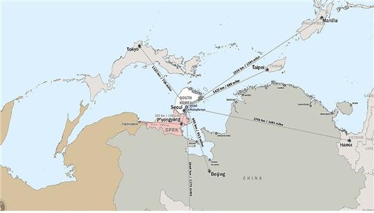 이 지도에 표시되지 않았지만 서울과 험프리스는 75km, 서울과 평양( 195km)은 평양과 다렌(200km)과 차이가 없다. 평양과 베이징(1300km)은 험프리스와 타이페이보다 짧다.