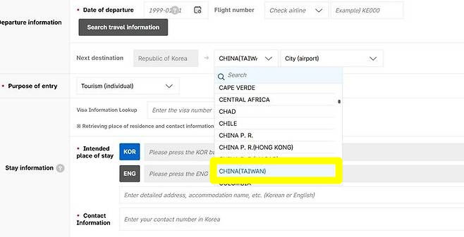 전자입국신고서 입력란에서 China P.R.(중화인민공화국), China P.R.(Hong Kong)과 China(Taiwan)가 'P.R.'의 유무에서 차이가 나지만, 대만은 Taiwan을 (괄호) 안에 넣은 것을 홍콩과 같은 특별자치구로 격하시킨 표기로 받아들인다.